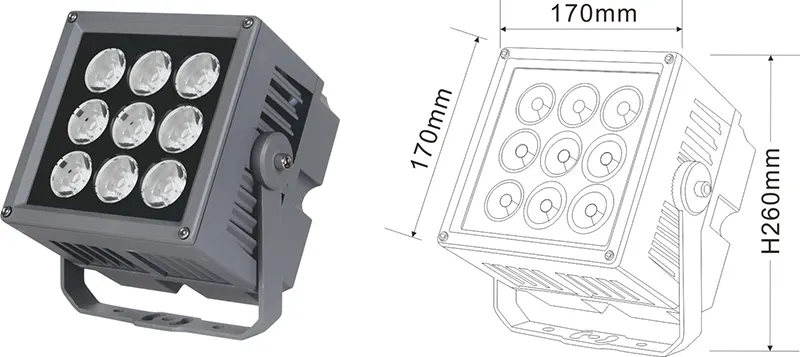| எல்.ஈ.டி லேண்ட்ஸ்கேப் ப்ரொஜெக்டர் | CON-TGD06-1 | 96*96*150 மிமீ | 9*2W | பொருள்: அலுமினியம்+மென்மையான கண்ணாடி அடைப்புக்குறி வகை: சரிசெய்யக்கூடியது ஐபி: ஐபி 67 வண்ண வெப்பநிலை விருப்பமானது: 3000K/4000K/6500K RGB / DMX512 RGBW / DMX512 சாம்பல், பொருந்தக்கூடிய கட்டிடத்தை தனிப்பயனாக்கலாம் முகப்பில் நிறம் |